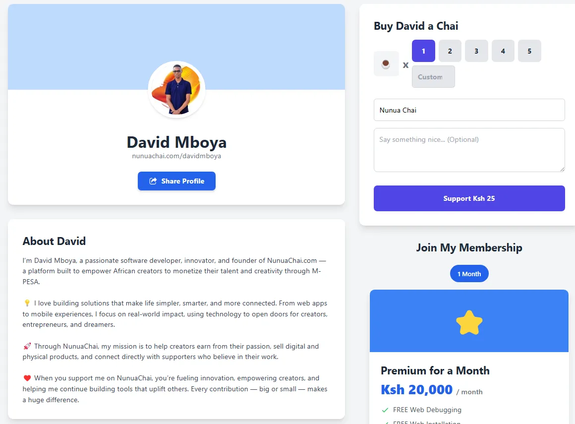I’m David Mboya, a passionate software developer, innovator, and founder of NunuaChai.com — a platform built to empower African creators to monetize their talent and creativity through M-PESA.